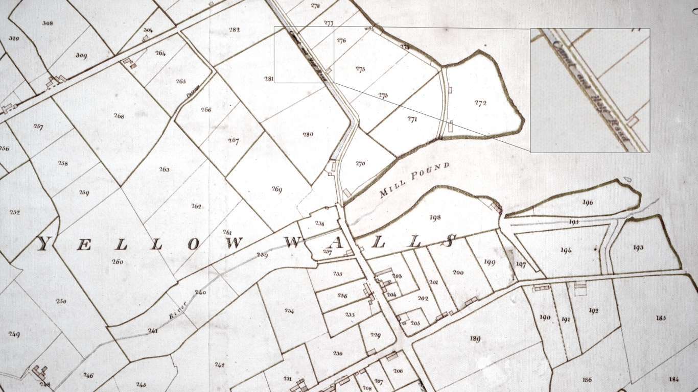 In an 1851 map3 (shown below) there is a canal running from the mill race along Old Yellow Walls road, marked as “Canal and Half Road” (a “half road” is essentially a pathway). This is some 60 years after the plan was first mooted. Could the scheme have been initiated but then abandoned upon Talbot’s death, with this section of unused canal remaining in place for decades until it was eventually filled in?