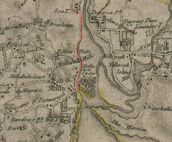 The clubhouse and boat pen of Swords Sailing and Boating club are built on reclaimed land2 and so the road would have passed to the inside of both – near the copse of trees in the above photo and parallel to the path that runs through Estuary Green. Historic ordnance survey maps show a well along the route3 and in Rocque’s 1762 map of Yellow Walls4, the road can be clearly seen.