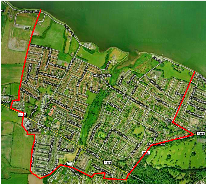 “The portion of the townland of Yellow Walls, in the parish of Malahide, which is bounded by the Malahide Strand or Estuary on the north, by Seatown East and Drinan on the west, and on the south and east by an imaginary line commencing at the western boundary of the said townland of Yellow Walls…”1