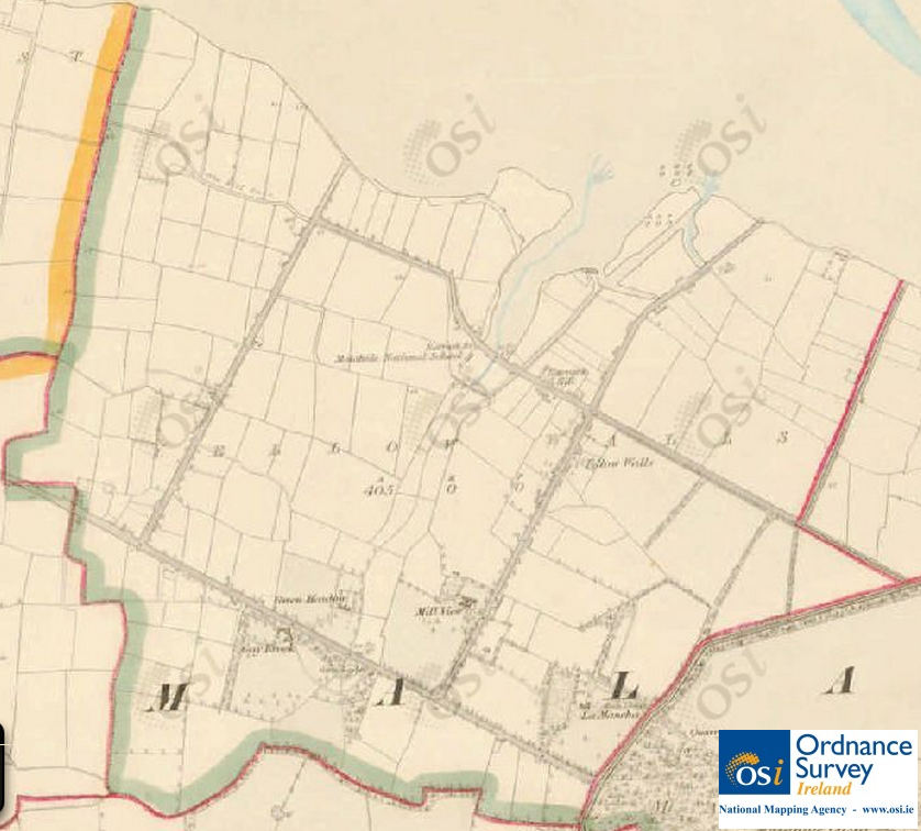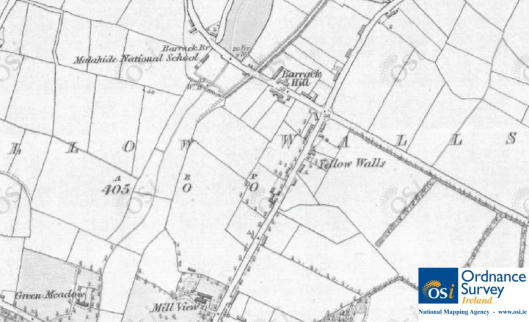 The highest rents are £6 – leases for 21 and 31 years. The farm produce is wheat, oats, barley and potatoes. The townland is closely intercepted by roads which are kept in good repair. In the S (south) part of the townland on the S side of the road from Swords to Malahide is Gay Brook house and on the N side are Green Meadow, Millview and La Mancha houses.